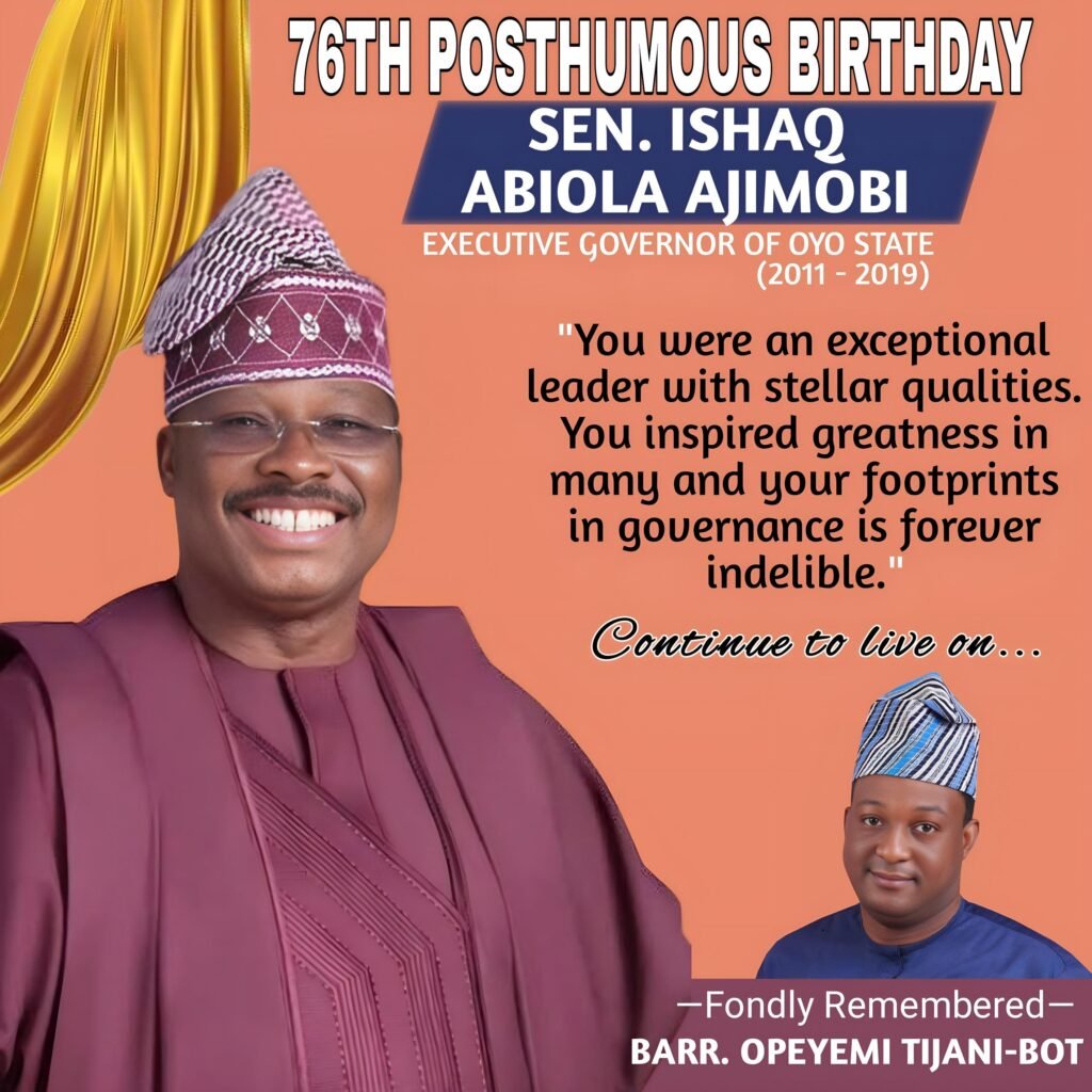 A prominent Ibarapa-born and member of the All Progressives Congress (APC) in Oyo State, Barrister Opeyemi Tijani (BOT), has today paid a glowing tribute to the late former Governor of Oyo State, His Excellency Senator Abiola Ajimobi, on the occasion of his 76th posthumous birthday.